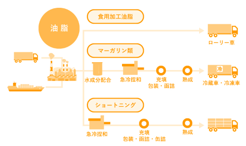 高度な精製技術と多種多用な品種に対応できる生産設備を保有し、原料油脂の精製から、各種加工品までの一貫生産体制により、お客さまのあらゆるご要望にお応えします。
